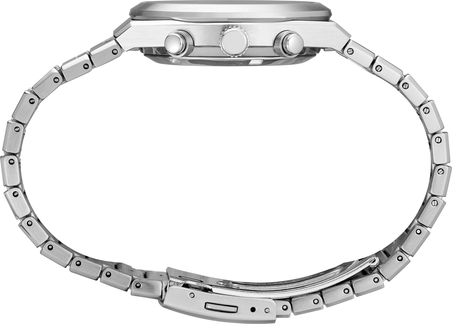 From the Essentials Collection. A modern take on a classic style, this contemporary watch features a sleek, angular case and bracelet design perfect for both dress occasions and everyday wear. The gray pressed pattern dial showcases three subdials, simple stick indices, a date calendar, and LumiBrite hands and markers. Crafted of stainless steel with a scratch-resistant sapphire crystal, this versatile timepiece is equipped with a chronograph function that measures up to 60 minutes of elapsed time in 1/5 second increments and includes a secure screwdown caseback and tri-fold push button release clasp. 10 bar, 100M Water Resistant