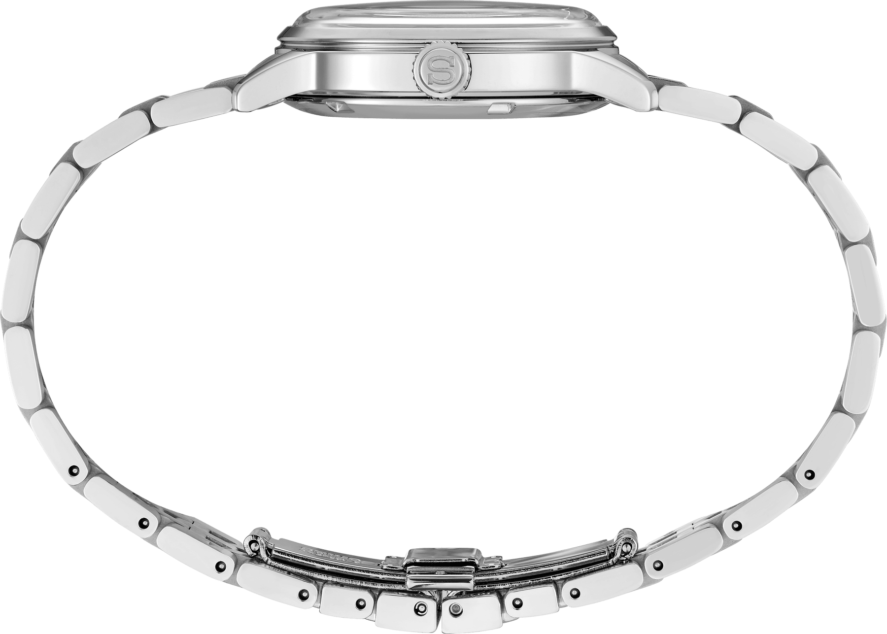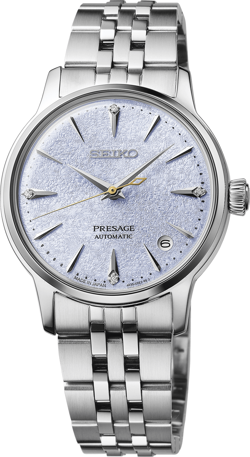 Seiko Presage Cocktail Time. Offering the finest in Japanese mechanical watchmaking, the Presage Collection blends precision technology with superior craftsmanship and design. Offering a graceful and fresh twist to the popular Cocktail Time series, this charming watch, inspired by the Frozen Skydiving cocktail, features a lovely light blue dial with a stunning pressed pattern evoking crunchy ice. Four diamonds, artfully incorporated into the signature wedge-shaped markers at 12, 3, 6, and 9 o’clock, add a luxurious sparkle. The streamlined case houses a 23-jewel automatic movement, which beats at a frequency of 21,600 vibrations per hour, with a power reserve of approximately 41 hours and manual winding capability. Crafted of stainless steel with a delicately tapered bracelet, this distinctive timepiece includes a date calendar, box-shaped crystal, screwdown caseback, and deployment clasp with push-button release. 5 bar, 50M Water Resistant