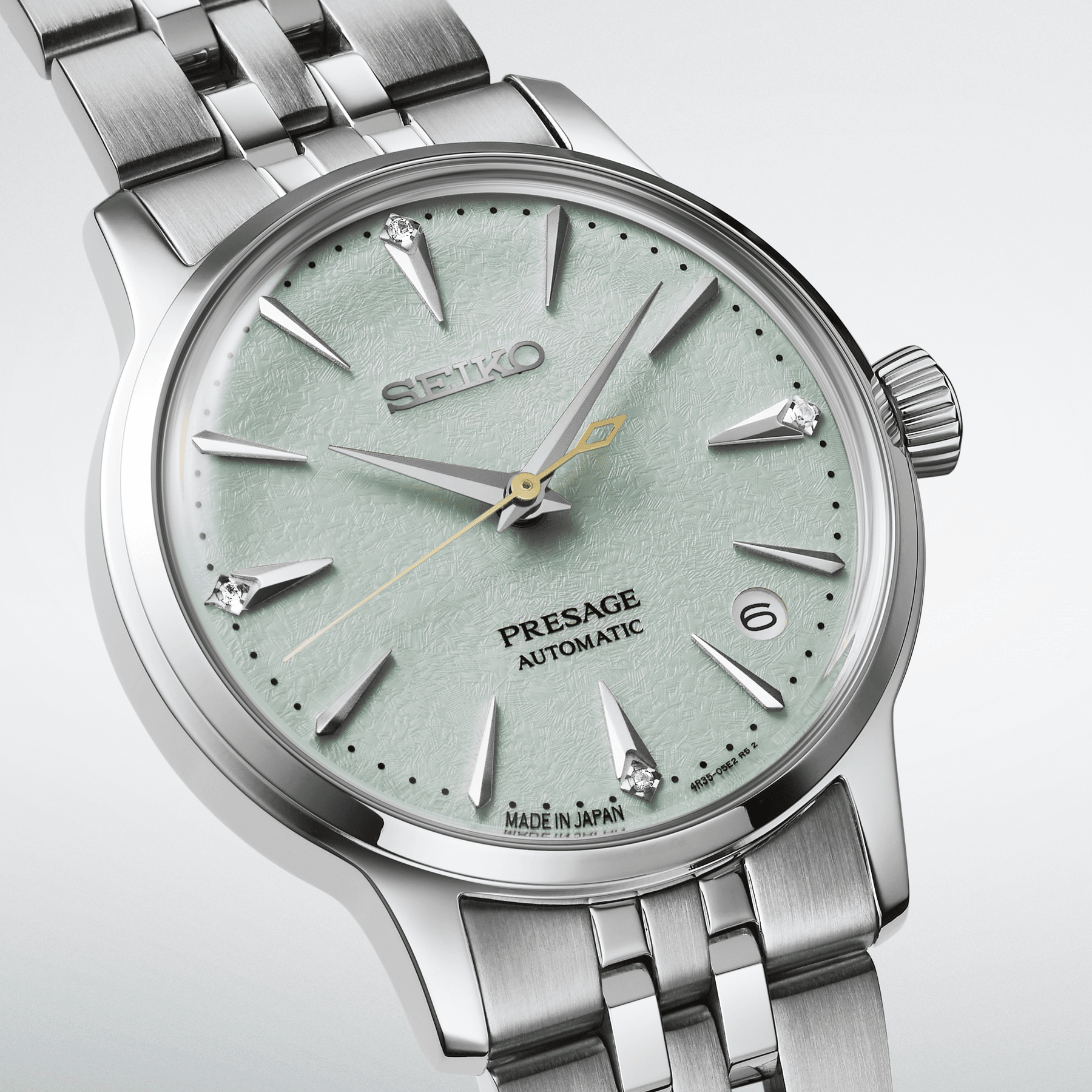 Seiko Presage Cocktail Time. Offering the finest in Japanese mechanical watchmaking, the Presage Collection blends precision technology with superior craftsmanship and design. Offering a graceful and fresh twist to the popular Cocktail Time series, this charming watch, inspired by the Frozen Mojito cocktail, features a lovely light green dial with a stunning pressed pattern evoking crunchy ice. Four diamonds, artfully incorporated into the signature wedge-shaped markers at 12, 3, 6, and 9 o’clock, add a luxurious sparkle. The streamlined case houses a 23-jewel automatic movement, which beats at a frequency of 21,600 vibrations per hour, with a power reserve of approximately 41 hours and manual winding capability. Crafted of stainless steel with a delicately tapered bracelet, this distinctive timepiece includes a date calendar, box-shaped crystal, screwdown caseback, and deployment clasp with push-button release. 5 bar, 50M Water Resistant