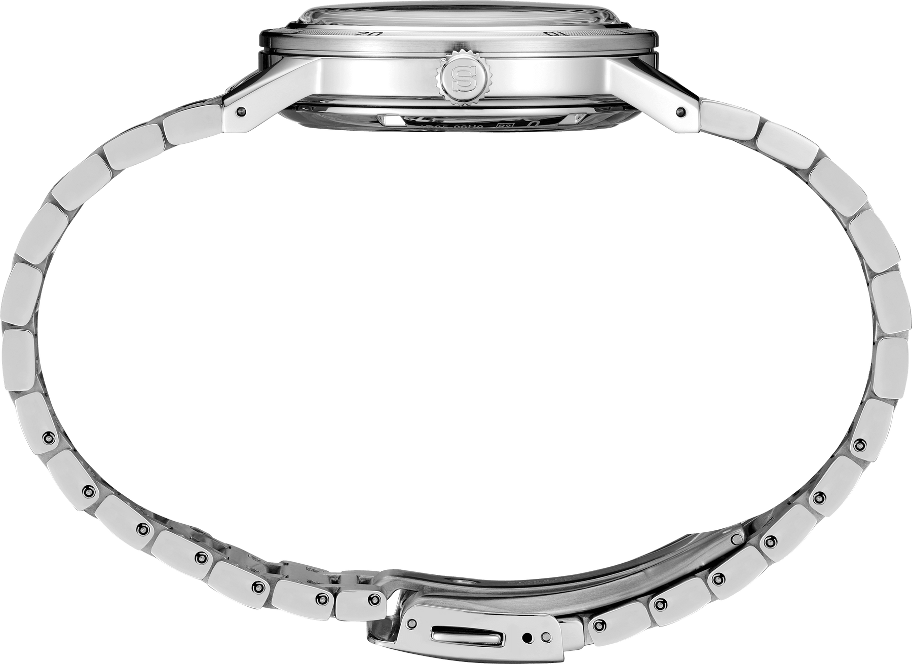 Presage Style60's Collection. Celebrating the fresh spirit of the 1960s, this design is an homage to Seiko’s 1964 “Crown Chronograph,” combining a bold ruggedness with a refined and tailored style. Framed by a coordinating metallic bezel, the multi-layer dial inherits the layout of the original model with a futuristic flair and an ice green color inspired by mid-century aesthetics. The faceted indices are polished for an elegant shine, enhanced by the stainless steel case and box shaped crystal, providing beautiful dimensionality. Visible underneath the screwdown see-through caseback, the 23-jewel automatic movement beats at a frequency of 21,600 vibrations per hour and offers manual winding capability with a power reserve of approximately 41 hours. Crafted of stainless steel, this versatile timepiece features a sophisticated multi-row bracelet, tri-fold push button release clasp, a date calendar and LumiBrite hands and markers for superior visibility. 5 bar, 50M Water Resistant