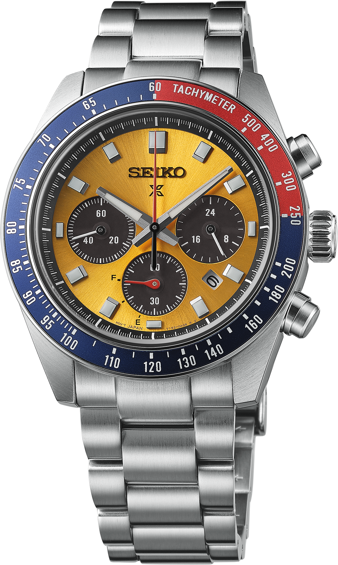 Seiko Speedtimer Solar Chronograph. Designed for those who treat life as the ultimate adventure, Seiko Prospex keeps moving forward, meeting every challenge with technological excellence and winning design. This rugged and stylish watch is part of a high-intensity collection inspired by the 1969 “Speedtimer,” the world’s first self-winding chronograph. Paying tribute to one of the first Speedtimer models, nicknamed by Seiko fans after a famous astronaut who wore the iconic original into space, this bold timepiece showcases a two-tone red and blue aluminum tachymeter bezel and a vibrant yellow dial with contrasting subdials. In a brilliant sunray finish, the dial also includes a 24-hour display, power reserve indicator, date calendar, and LumiBrite hands and markers. The chronograph function measures up to 60 minutes of elapsed time in 1/5-second increments and includes a split time function, while the solar cell, powered by any light source, with no battery change required, provides a 6-month power reserve when fully charged. Crafted of stainless steel, with a curved anti-reflective sapphire crystal and tapered three-link bracelet, this exceptional creation offers a secure screwdown caseback and a tri-fold push button release clasp. 10 bar, 100M Water Resistant -
