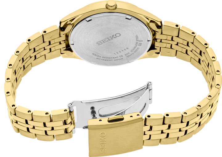 From the Essentials Collection. Offering classic dress/sport designs, the Essentials Collection provides the ideal solution for everyday wear. Crafted of stainless steel in gold-tone finish, this perfectly balanced watch features a champagne sunray dial with day/date calendar and sleek gold stick markers for a superb blend of clarity and style. 10 bar, 100M Water Resistant