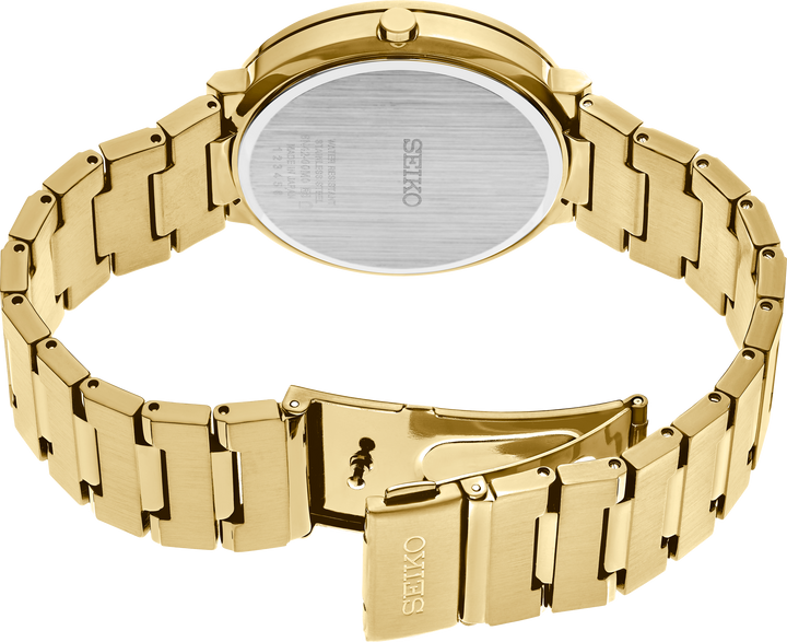 From the Essentials Collection. Offering classic dress/sport design, the Essentials Collection provides the ideal solution for everyday wear. With contemporary minimalism, this sharp and streamlined watch offers a sleek black sunray dial with gold accents and date calendar, and a slim and comfortable stainless steel case and bracelet in gold finish. 3 bar, 30M Water Resistant