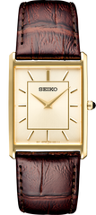From the Essentials Collection. Offering classic dress/sport design, the Essentials Collection provides the ideal solution for everyday wear. Giving a new slant to a traditional rectangular style with a subtly patterned light champagne sunray dial, this perfectly tailored watch features a stainless steel case in gold finish, cabochon crown and textured brown leather strap. 3 bar, 30M Water Resistant