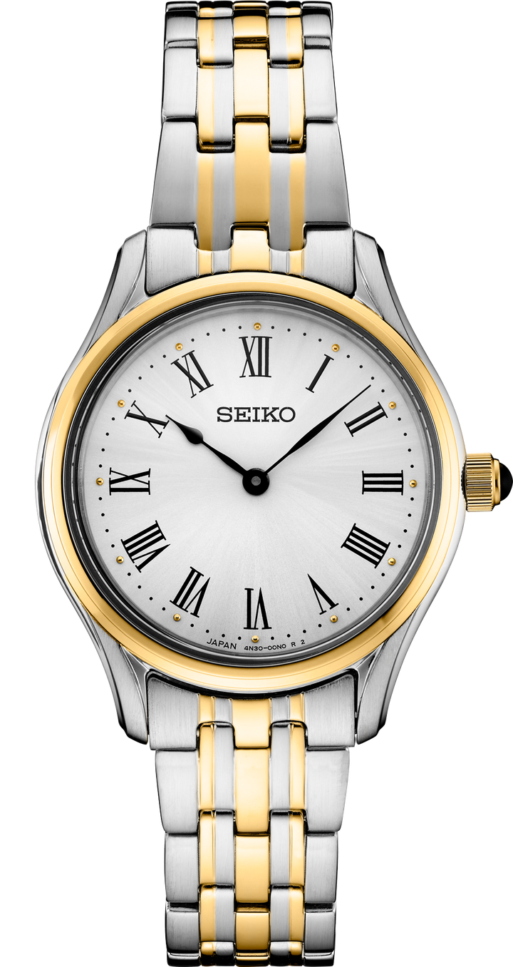 From the Essentials Collection. Offering classic dress/sport designs, in two sizes to suit anyone’s personal style, the Essentials Collection provides the ideal solution for everyday wear. Crafted of stainless steel in a versatile two-tone finish, this sophisticated design features a silver dial with elegant Roman numerals and finely shaped hands. Includes a classic cabochon crown, scratch-resistant sapphire crystal and tri-fold push button release clasp. 5 bar, 50M Water Resistant
